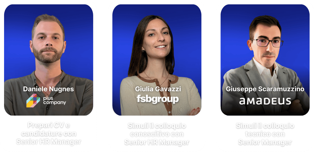 Terminata la call di consulenza potrai simulare un colloquio conoscitivo con un Senior HR Manager, e un colloquio tecnico con un Senior tecnico.